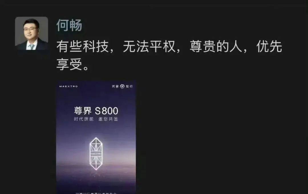 2月14日,网络上传播了一张朋友圈截图,截图中的何畅声称“有些科技,无法平权,尊贵的人,优先享受”,并附上尊界S800的海报作为配图。