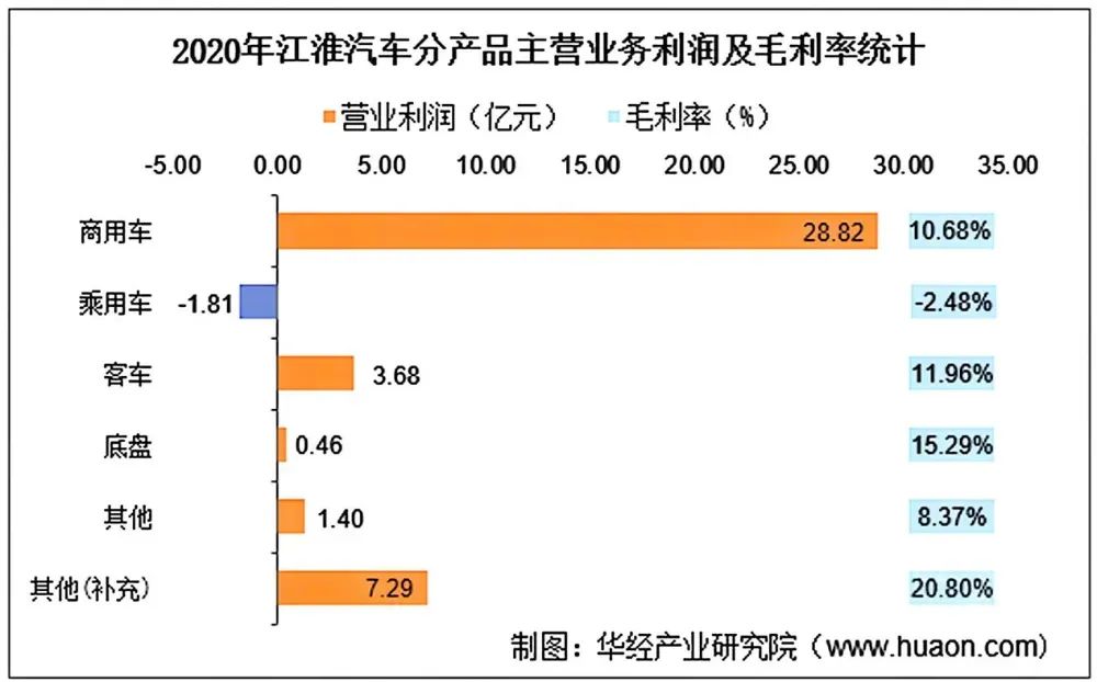 以2020年为例,江淮汽车主营业务总利润为39.84亿元。其中,商用车实现营业利润为28.82亿元,毛利率为10.68%;乘用车实现营业利润为-1.81亿元,毛利率为-2.48%。