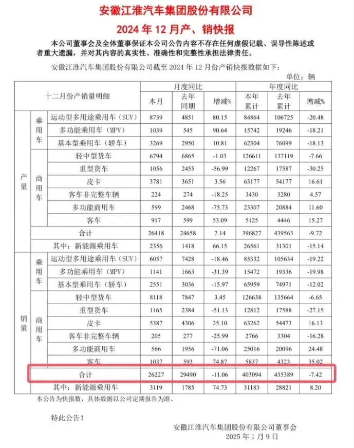 2024年江淮汽车产销快报