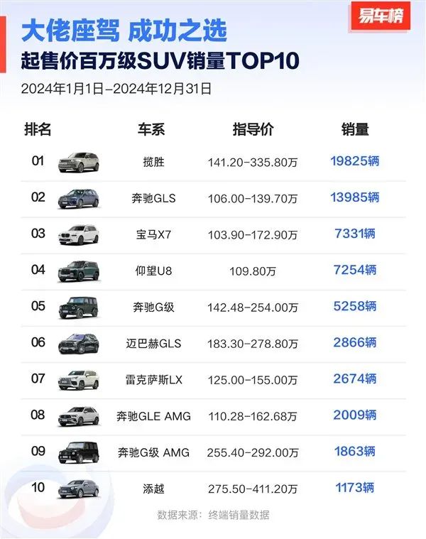 统计数据显示,2024年,国内百万级SUV排名第一的路虎揽胜,销量也不到2万辆。