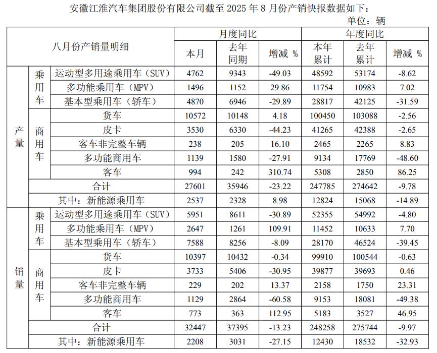 细分到车型,江淮汽车8月乘用车领域表现参差不齐。SUV产量为4762辆,同比减少49.03%;销量为5951辆,同比减少30.89%,产量下滑幅度远大于销量。MPV则呈现出逆势增长态势,产量为1496辆,同比增加29.86%;销量为2647辆,同比增加109.91%。轿车产量为4870辆,同比减少29.89%;销量为7588辆,同比减少8.09%,产量下降幅度较大,但销量相对稳定。