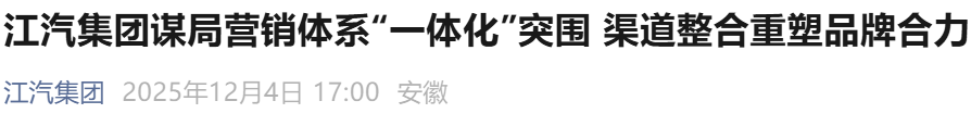 12月9日,据多家媒体及江淮集团此前报道,江汽汽车集团正式启动乘用车业务板块的营销渠道整合。此次整合涉及乘用车、新能源乘用车及皮卡三大业务板块,旨在打通内部资源壁垒,激发“江淮瑞风”“江淮钇钇为”“江淮悍途”三大品牌势能。