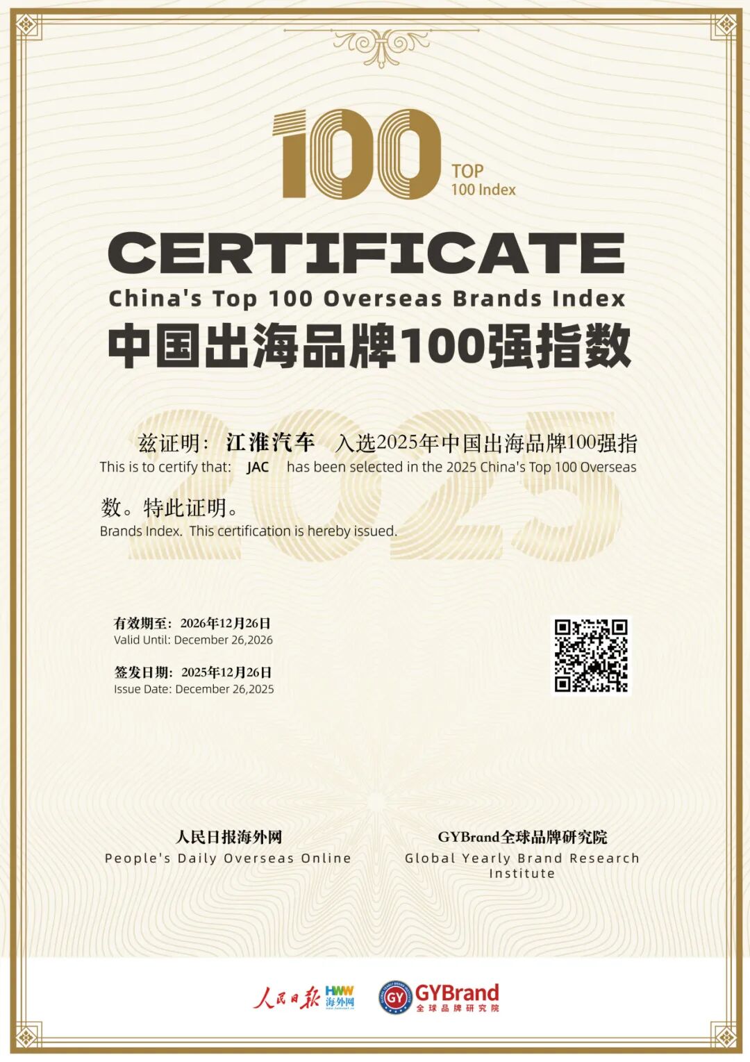 作为中国汽车产业出海的中坚力量,江淮汽车长期深耕海外市场,始终坚持以高品质产品与可持续发展理念拓展全球版图。此次入选“中国出海品牌100强”,标志着其品牌国际影响力、市场运营能力及创新能力获得权威认可。该榜单由人民日报海外网与GYBrand全球品牌研究院共同评定,覆盖品牌海外知名度、市场占有率及创新能力等多个核心维度,极具行业权威性与公信力,有效期至2026年12月26日。