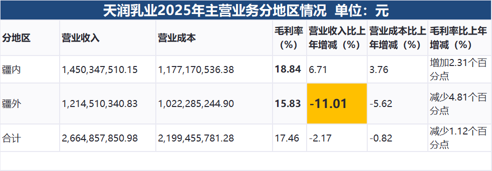 2025年公司疆外收入同比下降11.01%,且疆外毛利率为15.83%,低于疆内的18.84%。
