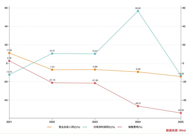 国药现代曾是A股“降本增效”的典型样本。在营收持续萎缩的背景下,2022年至2024年公司净利润却逆势攀升,从6.28亿元一路上涨至10.84亿元,2024年甚至创下了历史新高。支撑这一“奇迹”的秘密,藏在销售费用的极致压缩中:销售费用从2021年的34.85亿元逐年下降至2024年的11.52亿元,2025年进一步压降至5.3亿元,销售费用率仅5.67%,而2021年这一数字高达24.99%。
