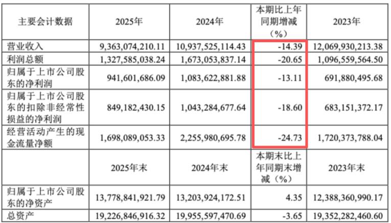 在此之前,公司刚刚交出了一份不太好看的2025年成绩单:全年营业收入93.63亿元,同比下降14.39%,这已是连续第四年营收萎缩;归母净利润9.42亿元,同比下降13.11%,此前连续三年的净利增长纪录也由此告终。