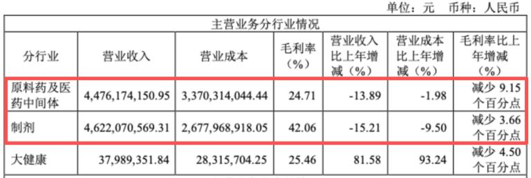 最直观的指标是毛利率的断崖式下滑。2025年全年,原料药及医药中间体板块毛利率已从上一年的33.86%降至24.71%,同比下降9.15个百分点。到2026年一季度,这一数字进一步跌至15.35%,相当于每100元收入中,仅剩下15元左右的毛利空间。