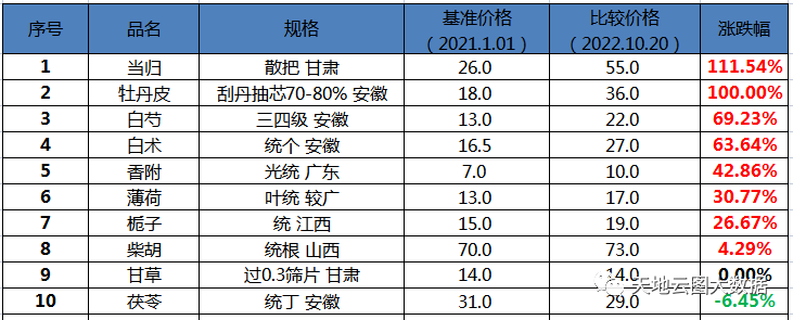 舒肝颗粒原料在22021年1月-2022年10月期间,8种原料品种价格上涨,占比80%,1种原料价格下跌,占比10%,1种原料价格走平,占比10%。