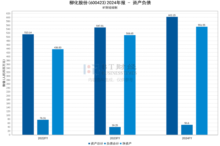 2024年末,柳化股份的总资产达到6.02亿元,同比增长9.90%。流动资产为4.96亿元,非流动资产为1.06亿元。总负债为50.6百万元,同比增长28.91%,其中流动负债为46.87百万元,非流动负债为3.73百万元。资产负债率从2023年的7.16%上升至8.4%,显示出公司在扩张过程中承担了一定的财务压力。