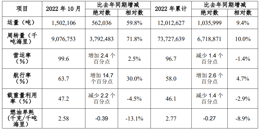 2022年11月9日,中远海特(600428.SH)发布2022年10月主要生产数据。