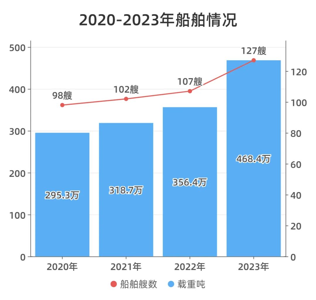 截至2023年底,公司拥有和控制船舶127艘,合计468.4万载重吨,同比2022年底增长31.43%;与“十三五”末相比,船舶艘数增加29艘,载重吨增长58.62%,凸显公司正在朝着规模化、大型化的行业引领者加速迈进。