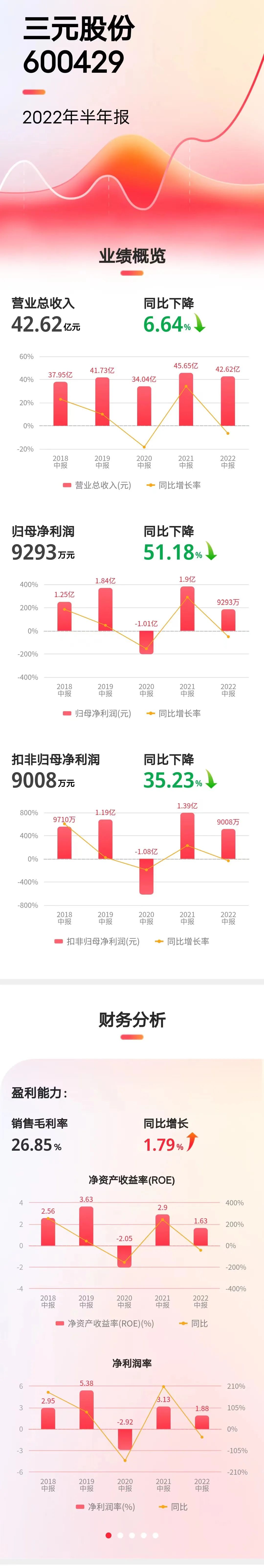 三元股份2022年中报显示,公司主营收入42.62亿元,同比下降6.64%;归母净利润9292.71万元,同比下降51.18%;扣非净利润9008.17万元,同比下降56.05%;其中2022年第二季度,单季度主营收入21.06亿元,同比下降13.56%;单季度归母净利润5133.04万元,同比下降56.41%;单季度扣非净利润5191.13万元,同比下降57.73%。