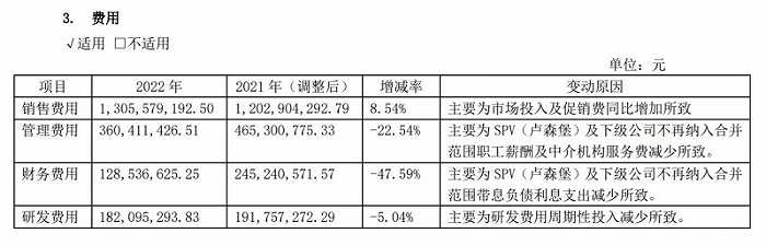 例如,2022年管理费用3.60亿元和上年相比,减少22.54%,主要原因就是SPV(卢森堡)及下级公司不再纳入合并范围而出现职工薪酬及中介机构服务费减少;财务1.29亿元和上一年度相比减少47.59%,也是相同原因而出现带息负债利息支出减少。此外,资产、负债的多个项目也是由于SPV(卢森堡)及下级公司不再纳入合并范围而出现比较明显的变动。