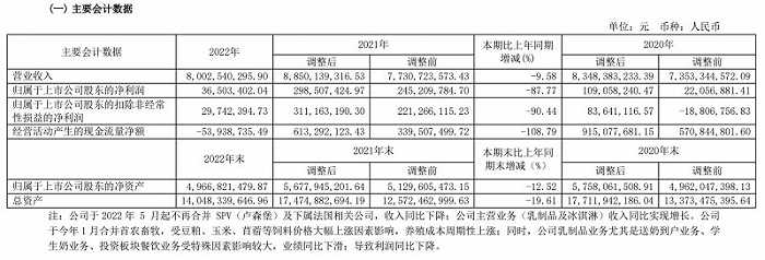 根据4月27日三元股份披露的2022年年报,全年实现营业收入80.03亿元,和上年同期相比,减少了9.58%;实现归属于上市公司股东的净利润3650.34万元,和上一年度的2.99亿元(调整后)相比,出现了87.77%的大幅下降。截至2022年年末,三元股份的归母净资产规模为49.67亿元,下降至不足50亿元,上年末归母净资产为56.78亿元(调整后)。