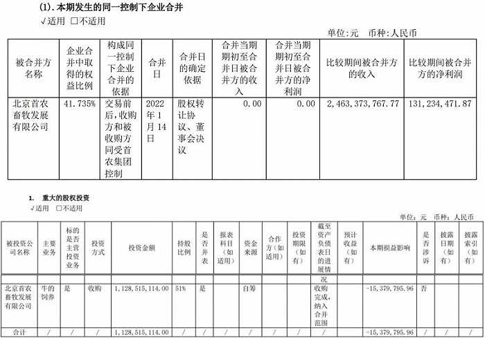 2022年1月份,三元股份合并北京首农畜牧发展有限公司(以下简称“首农畜牧”),其中,以现金10.16亿元购买首农畜牧41.735%股权,此前2019年三元股份已经以现金1亿元购买首农畜牧4.6325%股权;同时,三元股份购买北京星实投资管理中心持有的首农畜牧4.6325%股权。交易完成后,三元股份持有首农畜牧51%股权。