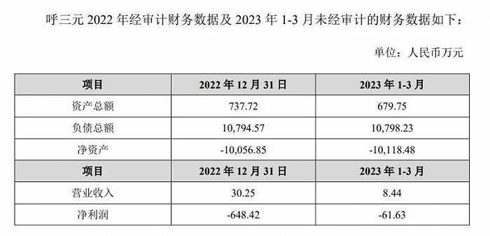 值得注意的是,呼三元已经长期处于资不抵债的状态,2023年3月末,其净资产为-10118.48万元。