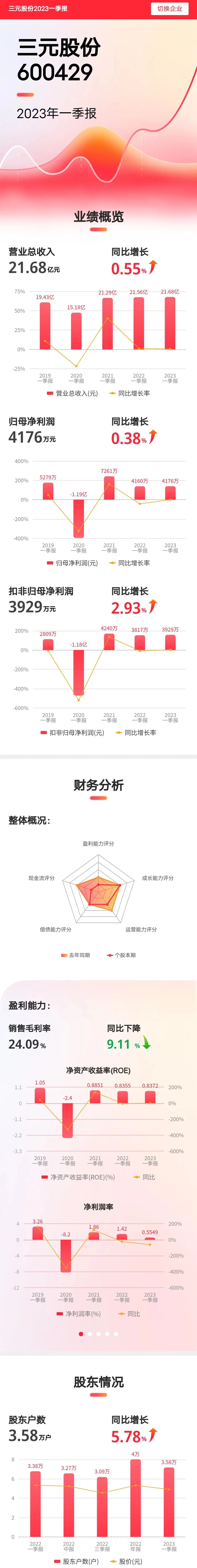 近日,三元股份披露2023年第一季度报告,今年1至3月营业收入21.68亿元,归母净利润4176万元,分别较上年同期增长0.55%、0.38%。