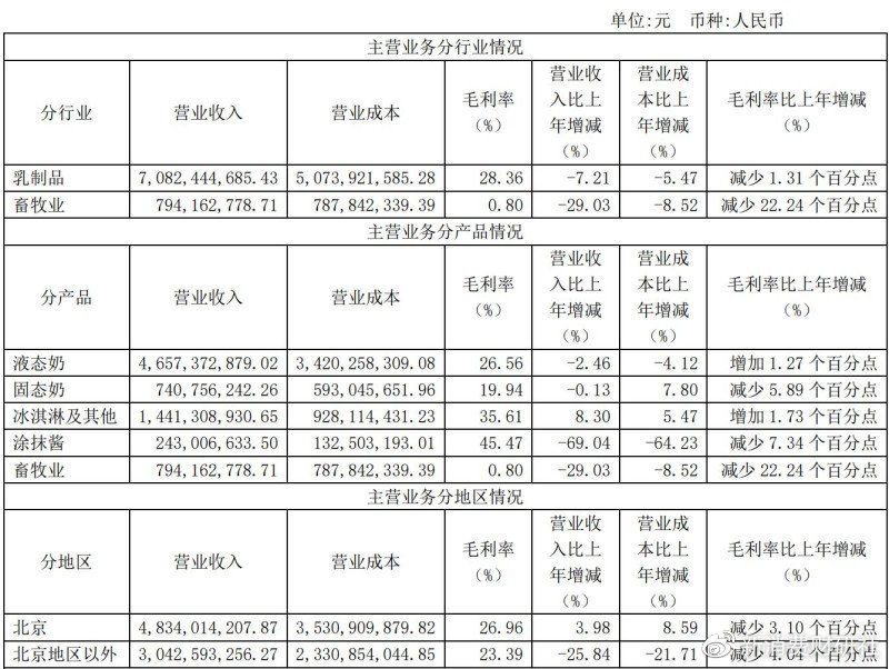 公开资料显示,三元股份主要从事乳制品制造业及畜牧业,旗下有低温鲜奶、低温酸奶、常温牛奶、常温酸奶、奶粉、奶酪、冰淇淋等几大产品系列。