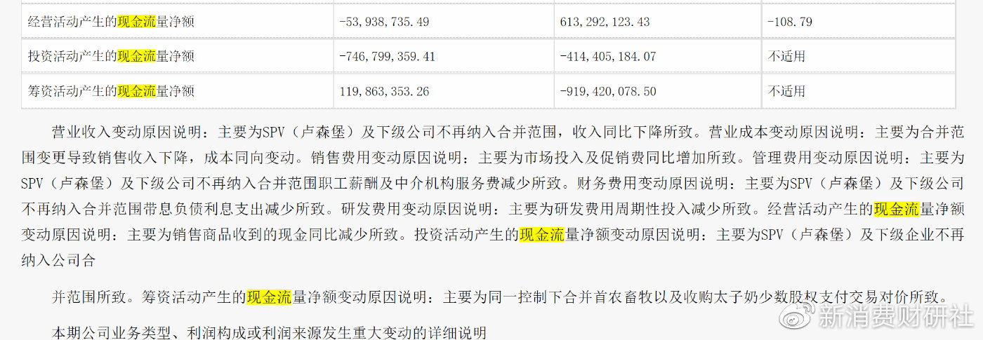 对此三元股份给出的解释为,经营活动产生的现金流量净额变动原因主要为销售商品收到的现金同比减少所致。投资活动产生的现金流量净额变动原因主要为SPV(卢森堡)及下级企业不再纳入公司合并范围所致,筹资活动产生的现金流量净额变动原因主要为同一控制下合并首农畜牧以及收购太子奶少数股权支付交易对价所致。