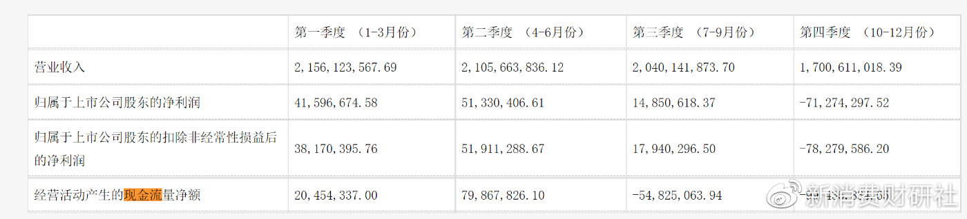 从时间线上看,2022年第一第二季度,三元股份经营活动产生的现金流量净额还均为正值,分别约为2045万元、7987万元。到了第三季度和第四季度,这一数据骤然下降到-5482万元以及-9943万元。