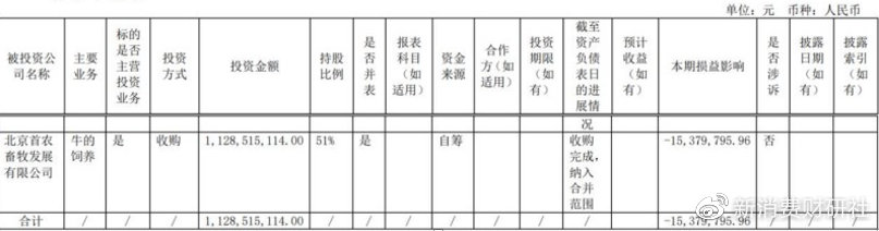2022年年报显示,三元股份对首农畜牧的投资金额为11.29亿元,收购完成后纳入合并报表,在2022年对三元股份的损益影响为-1537.98万元。