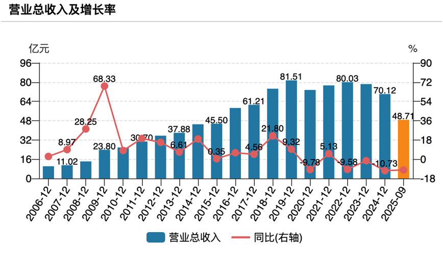 相比利润端的短暂改善,三元股份的营收下滑趋势更值得警惕。根据业绩预告,2025年公司预计实现营业收入约63.5亿元,这已是连续第四年出现下滑。