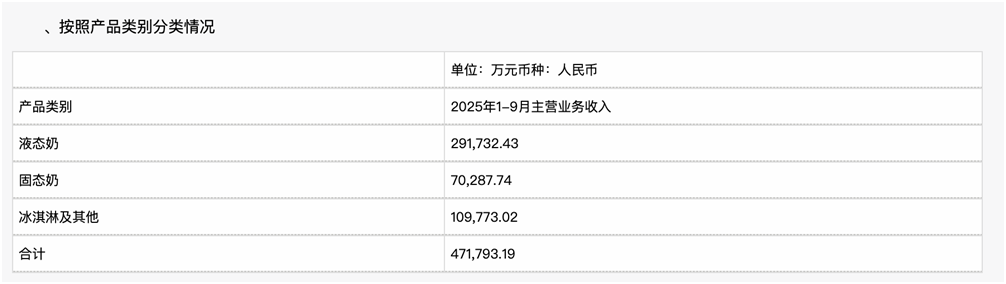 细分业务方面,数据显示,2025年前三季度,公司的液态奶业务营收29.17亿元,同比下滑13.16%;固态奶(奶粉)营收7.03亿元,微增4.1%,也是唯一正增长品类,主要受益于婴幼儿配方奶粉业务;冰淇淋及其他业务的营收10.98亿元,同比下滑14.29%,八喜品牌虽保持高端地位,但受季节性及渠道收缩影响。乳制品板块合计47.18亿元,同比下滑11.2%。