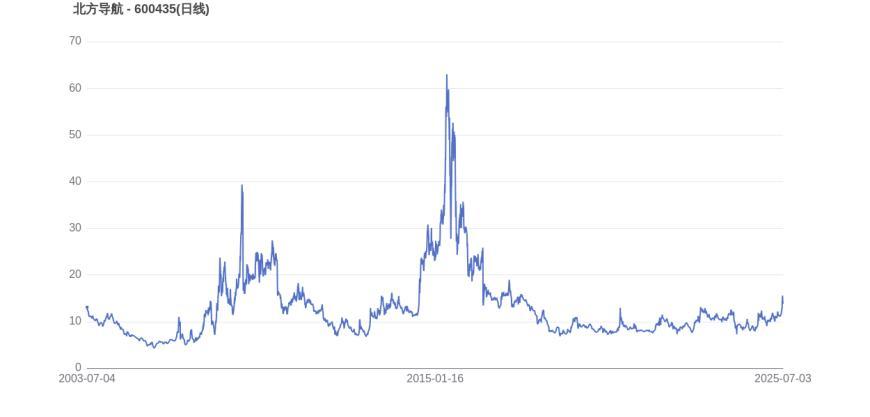从上市首日至今,北方导航的市值实现了16.99倍的增长,显示出长期投资价值。2015年5月27日,北方导航的市值巅峰达到486.64亿元,股价也顺应升至65.35元。而至7月3日收盘,北方导航的股价为14.05元,市值为212.21亿元,相比峰值时期市值减少274.42亿元,市值蒸发了56.39%。