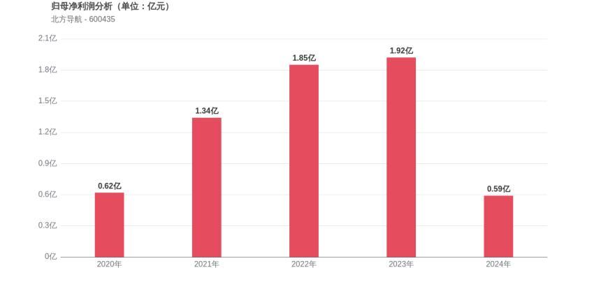 利润角度分析,2020年北方导航实现归母净利润0.62亿元,2024年0.59亿元。近五年利润波动明显,2021年曾实现113.67%的高增长,但2024年出现大幅下滑。