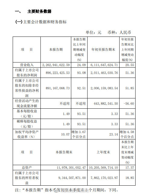 其中,第三季度实现营业收入22.63亿元,同比增长24.09%,实现净利润8.96亿元,同比增长93.08%。