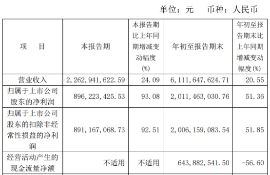 2021年9月,片仔癀实现营业收入22.63亿元,同比增长24.09%;实现归属于上市公司股东的净利润8.96亿元,同比增长93.08%;实现归属于上市公司股东的扣除非经常性损益的净利润8.91亿元,同比增长92.51%。