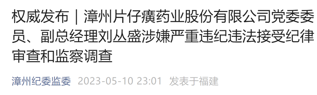 漳州片仔癀药业股份有限公司党委委员、副总经理刘丛盛涉嫌严重违纪违法,目前正接受漳州市纪委监委纪律审查和监察调查。