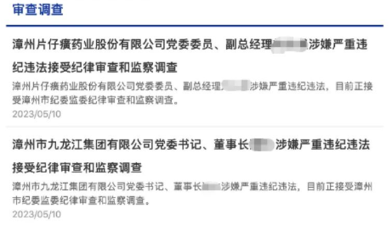 2023年5月,漳州市纪委监委先后发布两则公告,漳州市九龙江集团有限公司党委书记、董事长潘杰,漳州片仔癀药业股份有限公司党委委员、副总经理刘丛盛被查,均涉嫌严重违纪违法。