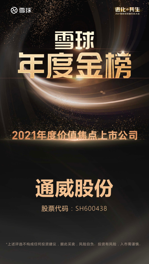 近日,雪球发布了2021年度金榜评选结果,正式公布了“2021年度价值焦点上市公司”、“2021年度影响力上市公司TOP100”等年度榜单。通威股份荣登“2021年度价值焦点上市公司”榜单。