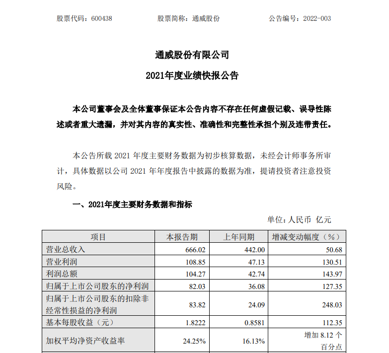 公告显示,通威股份2021年扣非净利润为83.82亿元,同比增长248.03%;基本每股收益为1.82元/股,同比增长112.35%。
