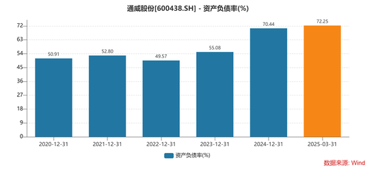 从近三年年报及 数据维度观察,通威股份负债规模上演“指数级膨胀”戏码:2022 年末,负债规模为 719.99 亿元;步入 2023 年末,攀升至 905.34 亿元,同比增幅达 25.7%;到 2024 年末,进一步飙升至 1379.98 亿元,相较 2023 年末,涨幅高达 52.4%;