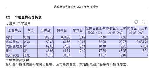 公司业绩承压,主要原因是受到光伏产业链市场价格大幅下降、甚至低于行业现金成本的冲击,叠加公司长期资产减值报废10.65亿元影响。反映到经营端,通威 2024 年光伏业务收入 598 亿元,同比下降 41.85%;毛利率仅 4.67%,较上年减少 28.20 个百分点。