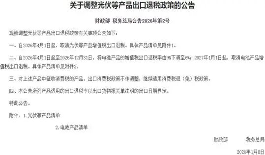 近年来,我国光伏行业出口退税率逐步下降。从2024年12月1日起,光伏硅片、电池及组件的出口退税率已从13%降至9%。财政部和国家税务总局日前宣布,自2026年4月1日起取消光伏等产品增值税出口退税,通威股份出口业务的毛利率届时也将受到影响。