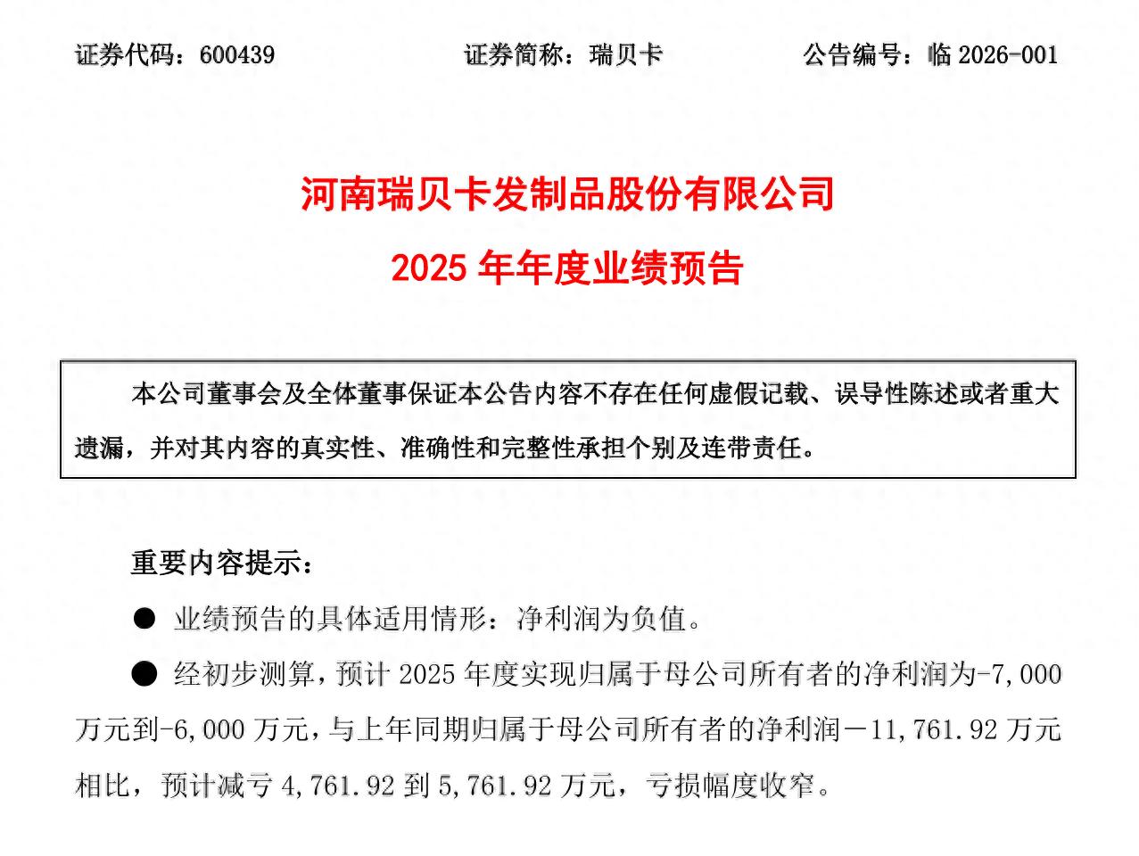 近日,“河南假发大王”瑞贝卡(600439.SH)发布2025年年度业绩预告,预计全年归属于母公司所有者的净利润为-7000万元到-6000万元,虽较上一年度亏损有所收窄,但仍深陷亏损泥沼。