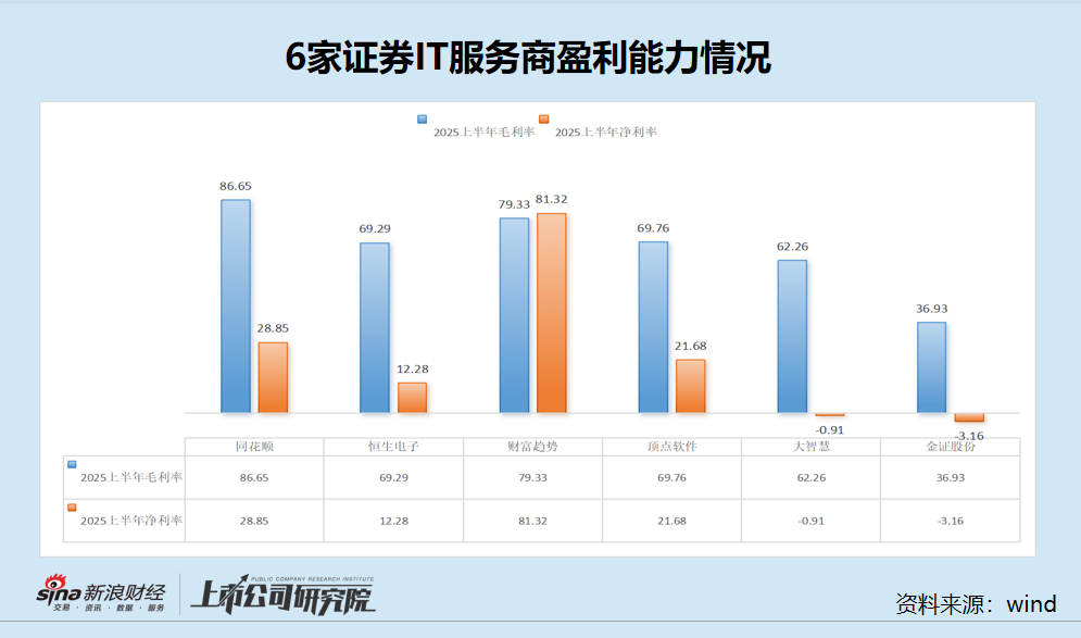 在下游行业火热的情况下,证券IT行业的主要上市公司(选取恒生电子、同花顺、财富趋势、顶点软件、大智慧、金证股份作为主要参考)业绩表现不一。 6家公司中,金证股份多项指标垫底,净利润垫底、营收降幅近50%增幅垫底、毛利率垫底、研发费用率垫底……并且公司连续亏损。
