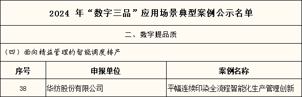 近日,工业和信息化部对2024年“数字三品”应用场景典型案例拟公布名单进行了公示,共有213个案例最终入选2024年“数字三品”应用场景典型案例。其中,在“数字提品质”中的“面向精益管理的智能调度排产”部分,华纺股份申报的“平幅连续印染全流程智能化生产管理创新”成功入选。