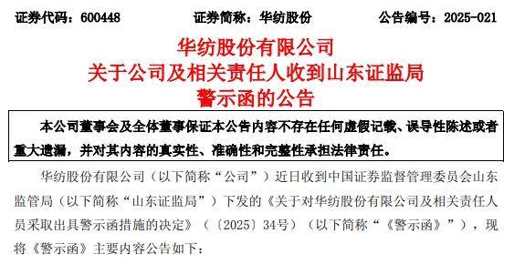 在警示函中,山东证监局还强调了公司应深刻反思此次违规行为,加强对相关法律法规的学习,以提升公司的规范运作水平和信息披露质量。同时,要求华纺股份在收到决定书后的30日内,向山东证监局提交一份书面报告,详细阐述公司的改进措施和未来的发展规划。