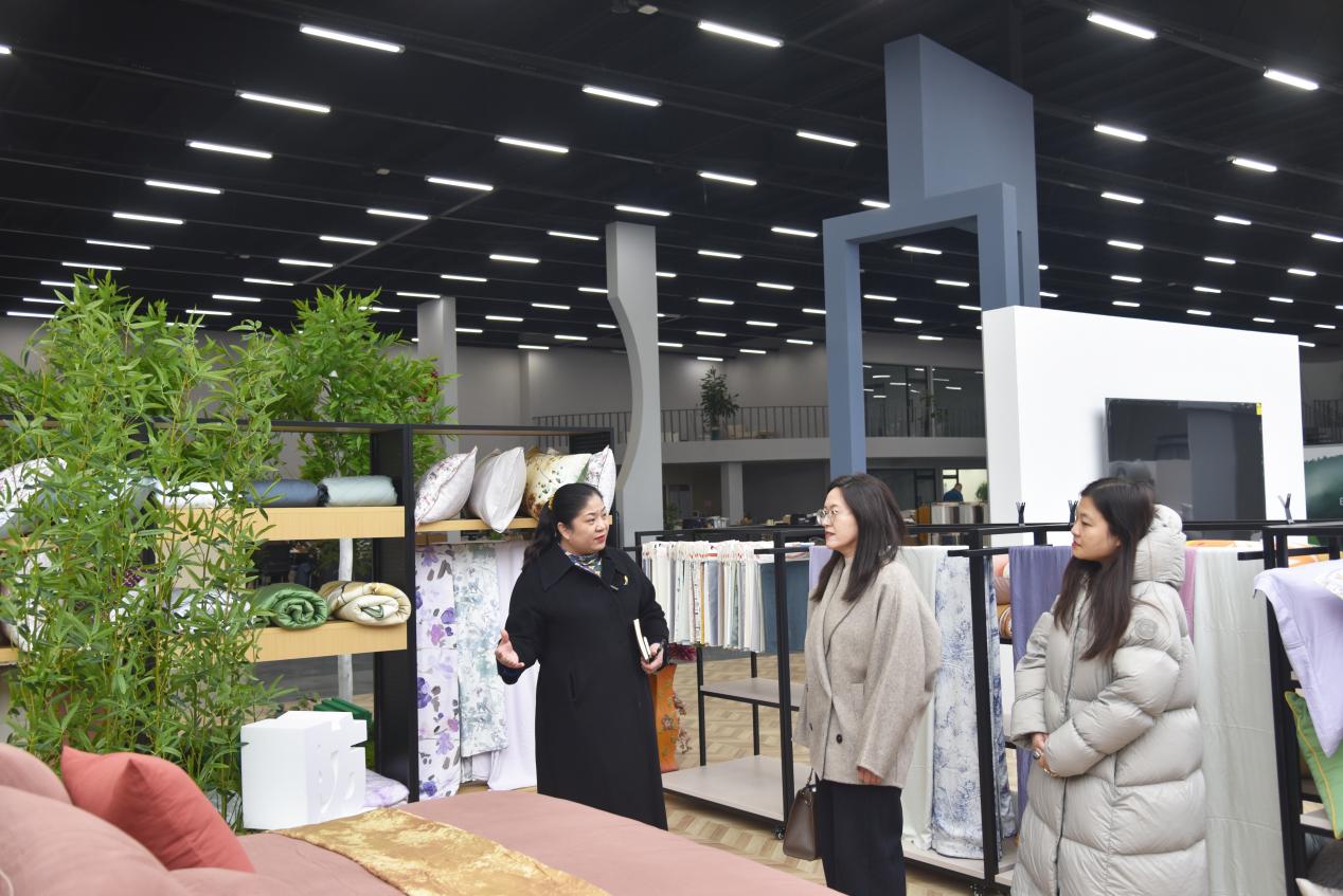 王滢一行实地参观了华纺智云中心、检测中心、综合办公区、花布分公司、家纺分公司、创意中心、研究院等区域,重点了解了华纺家纺成品、花布以及航空文创联名SKYKITS系列等产品的市场运营与推广情况。
