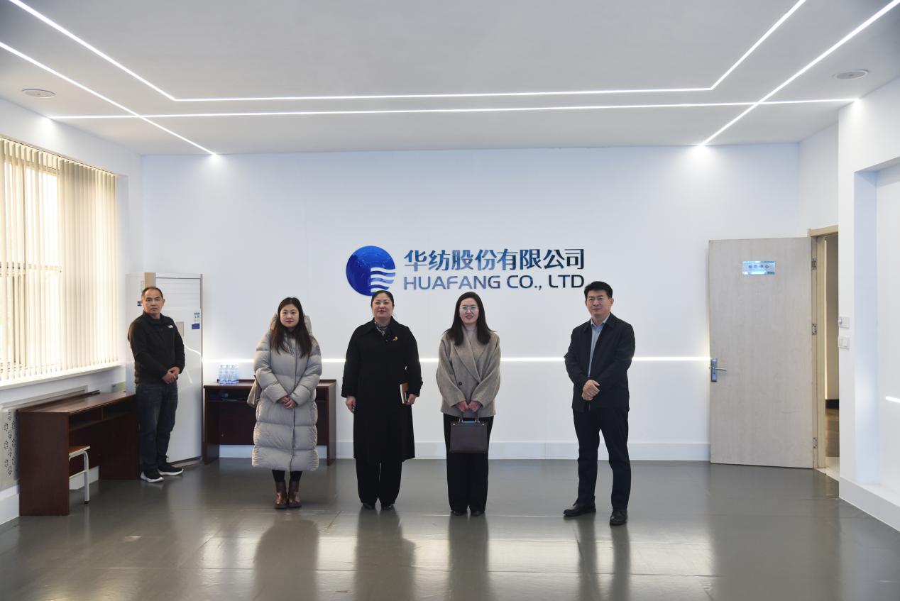 11月17日,山东航空学院外国语学院副院长王滢一行到华纺股份参观交流。华纺股份党委委员、副总经理孙玉涛,花布分公司总经理付健祥,华纺国际分公司总经理石鲁美陪同。