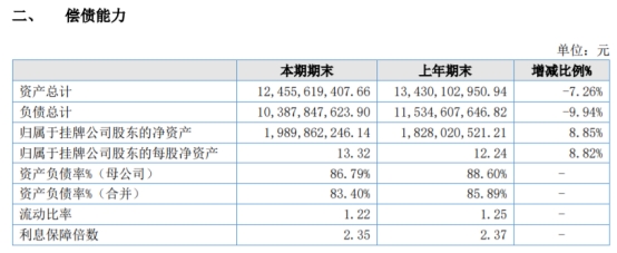 中建信息资产负债率(合并)本期期末为83.40%,流动比率为1.22。