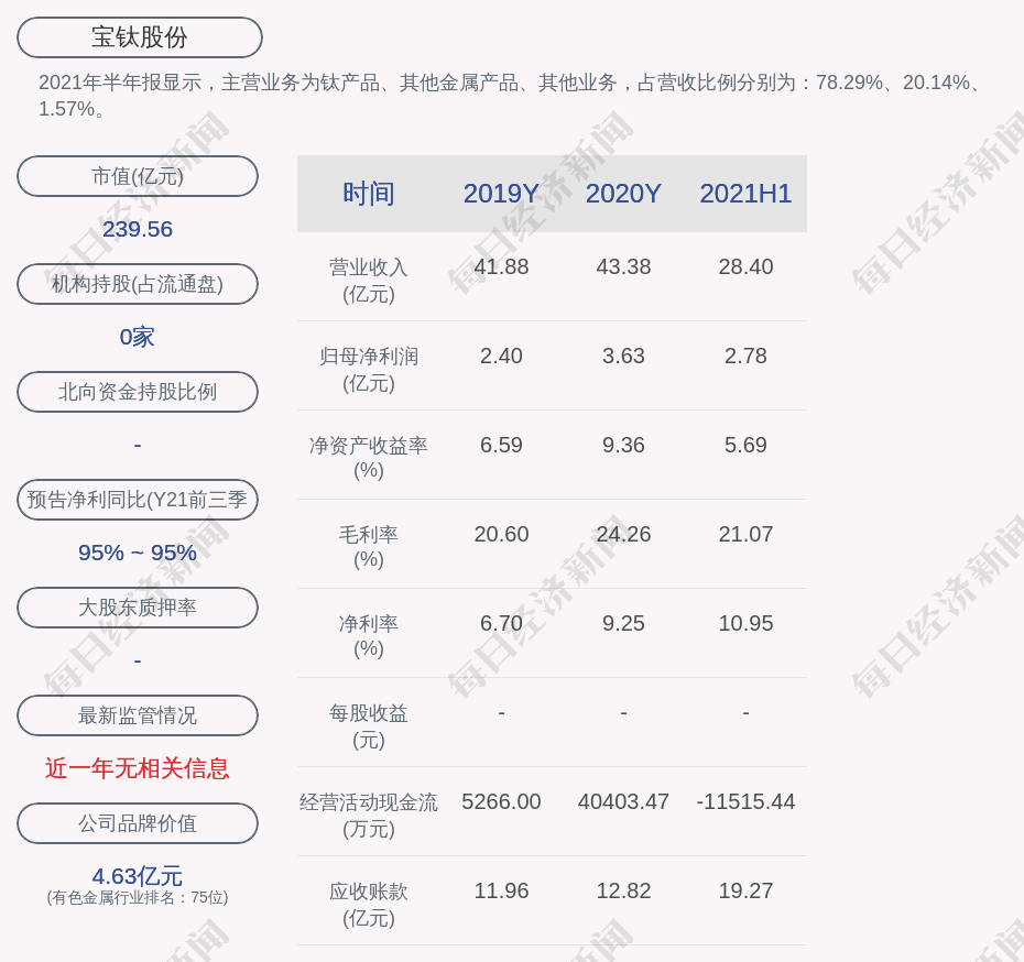 2021年半年报显示,宝钛股份的主营业务为钛产品、其他金属产品、其他业务,占营收比例分别为:78.29%、20.14%、1.57%。