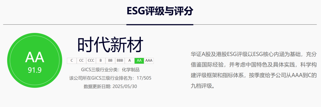 根据华证ESG官网数据,时代新材在化学制品行业505家企业中位列第17位(前3.4%),全A股仅5.86%企业达到“AA”及以上水平。
