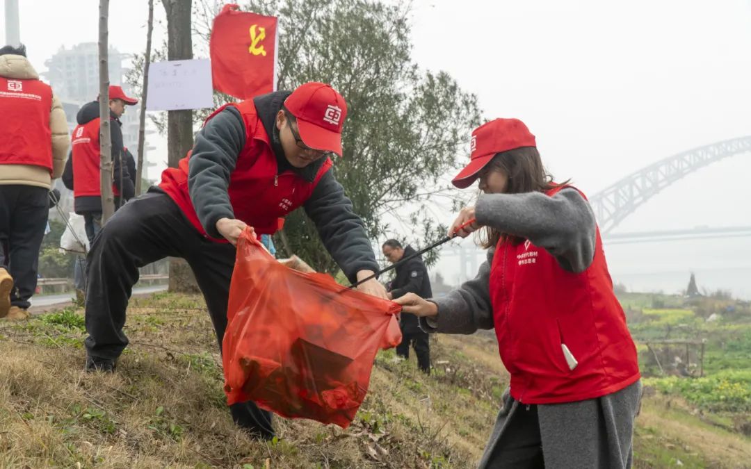 ▲时代新材青年志愿者在湘江边开展净滩护河行动