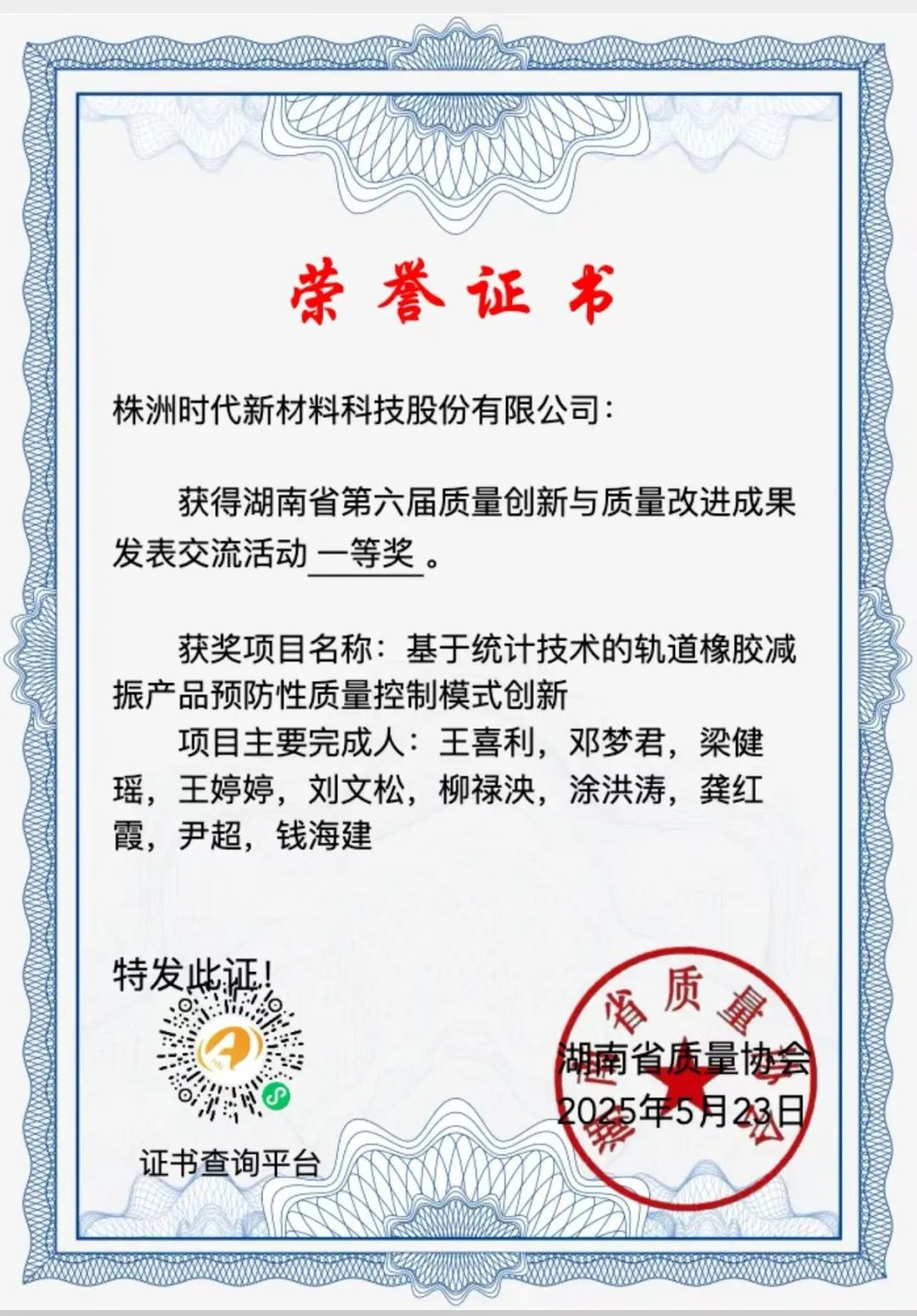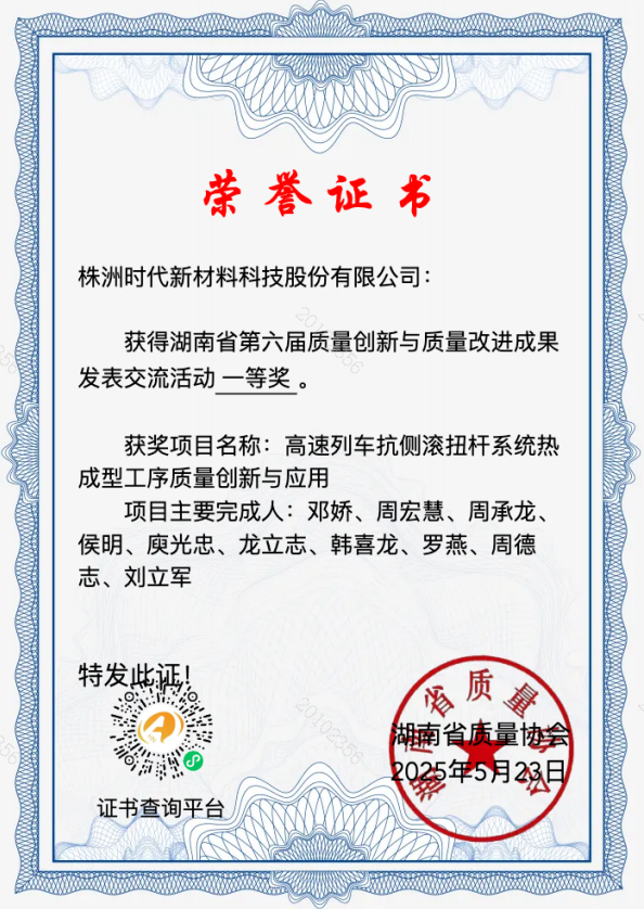近日,在湖南省第六届质量创新与质量改进成果发表会上,时代新材“高速列车抗侧滚扭杆装置热成型工序质量创新与应用”和“基于统计技术的轨道橡胶减振产品预防性质量控制模式创新”两个项目双双斩获一等奖,展现了时代新材在质量创新领域的优异成果。