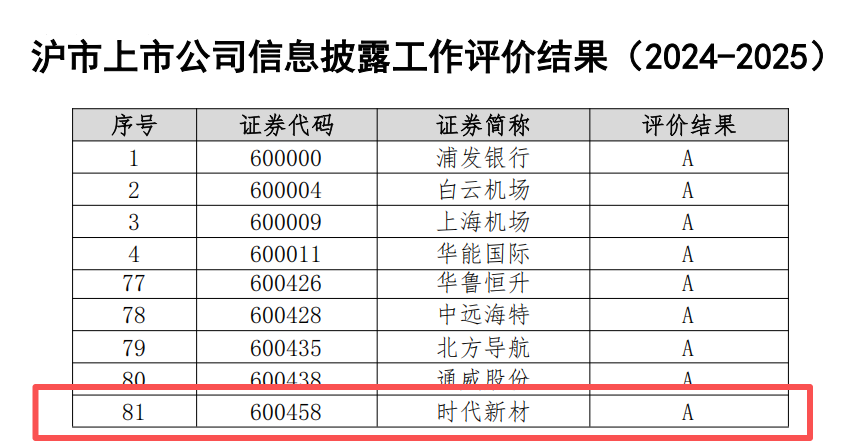 10月,时代新材连续第二年获评上交所信息披露工作最高评级“A”级,充分体现了公司在信息披露质量、公司治理及投资者关系管理方面的规范与卓越表现。